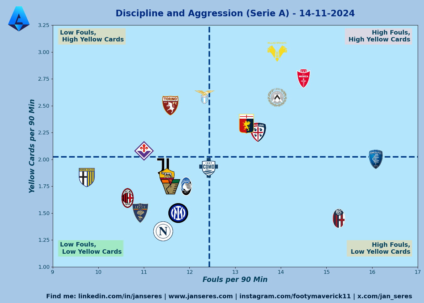 Explore a dynamic collection of 30 scatter charts showcasing key metrics from all Serie A matches for the 2024-2025 season. Each chart lets you compare teams relative to others, highlighting performance differences in various aspects. Click on any image to enlarge it for a more detailed view. The data will be regularly updated throughout the season to keep you informed. The data used for this analysis is sourced from the fbref website. Dive into detailed statistics, compare teams, and gain deeper insights into the performances within Serie A.